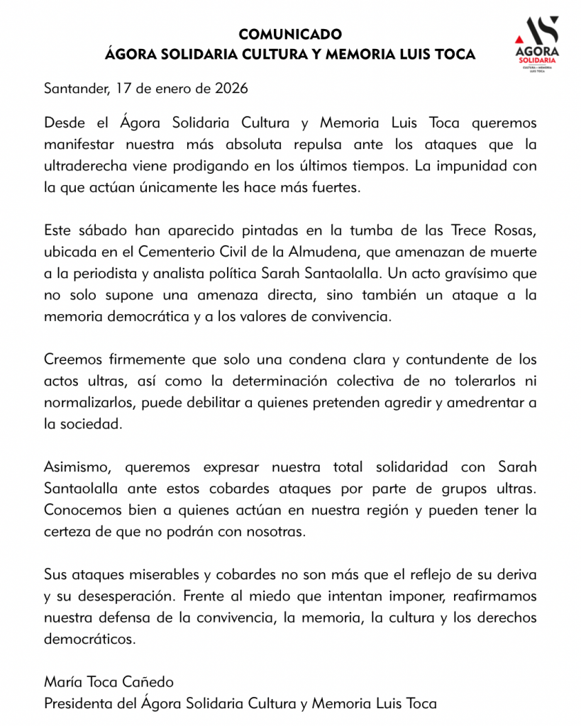 La entidad se ha pronunciado tras la aparición este sábado de pintadas en la tumba de Las Trece Rosas, situada en el Cementerio Civil de la Almudena (Madrid), en las que se incluían amenazas de muerte dirigidas a la periodista y analista política Sarah Santaolalla. Para la entidad, se trata de un hecho “de extrema gravedad”, al considerar que supone no solo una intimidación directa, sino también un ataque contra la memoria democrática y los principios de convivencia.